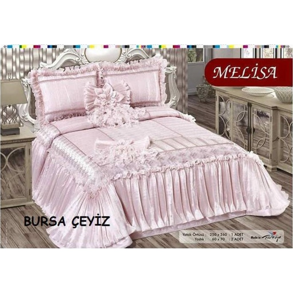 40x40 cm 1 çeyiz diyarı. 260 x 270 cm 2 adet yastık kılıfı. Melisa yatak örtüsü. Melisa yatak örtüsü çift kişilik pudra cyzyatk1.